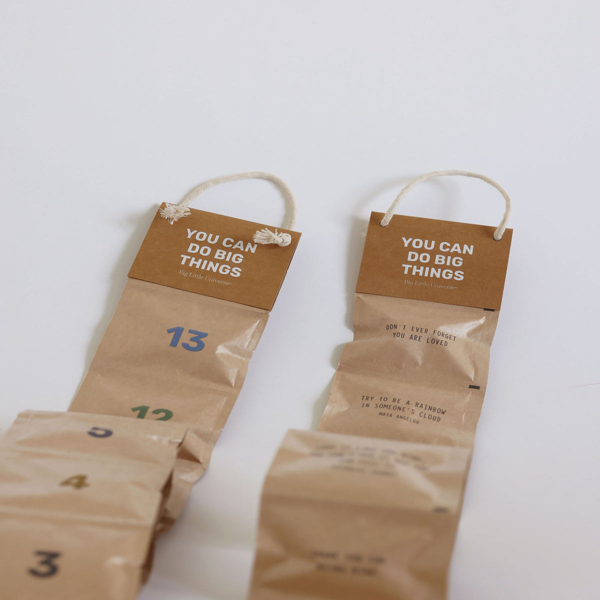 Each pouch includes a phrase, quote or thoughtful question for you and your little ones