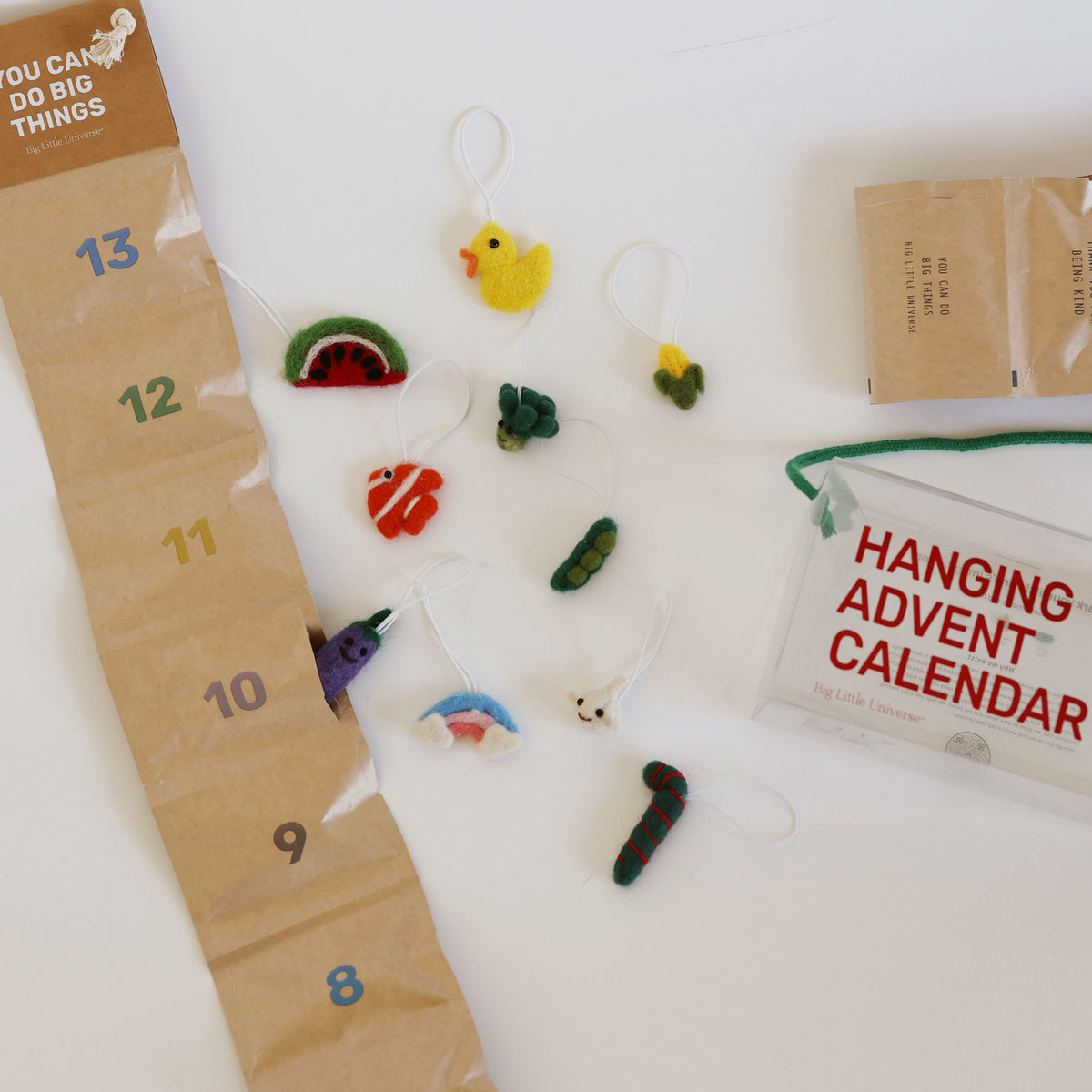 Our advent calendar will help with many different developmental skills and has many play features. Fine motor skills in tearing, holding and hanging and using the ornaments. Communication skills when identifying or practicing speaking about the different shapes. Social skills because we added in a pouch that you can share with a loved one.